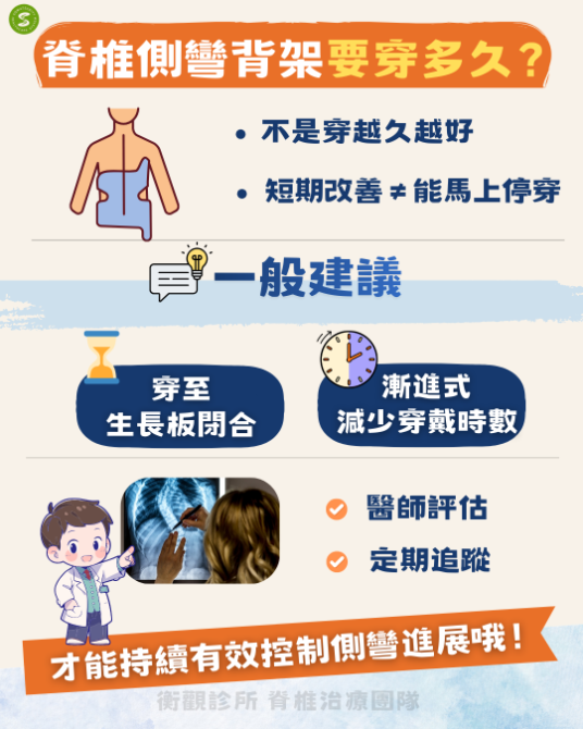 - 也不能因為短期進步,就自行提前停穿,過早脫離背架,往往會讓側彎在不知不覺中再次惡化。