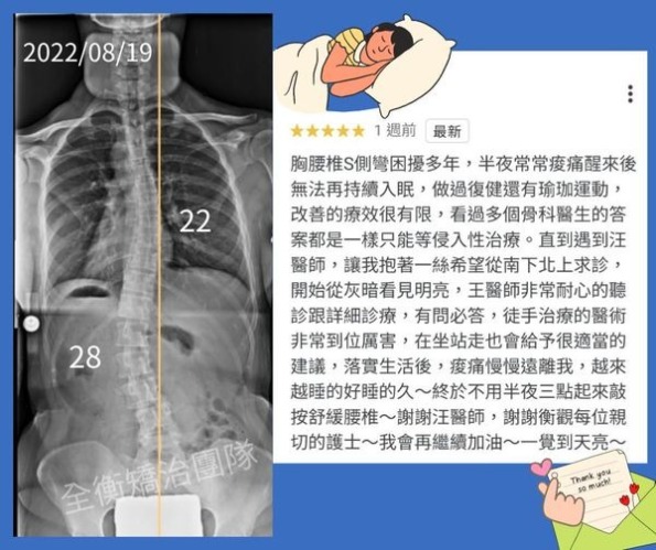 一位來自南部的成年側彎患者,多年來飽受脊椎側彎引發的長期痠痛之苦,甚至嚴重影響睡眠品質。